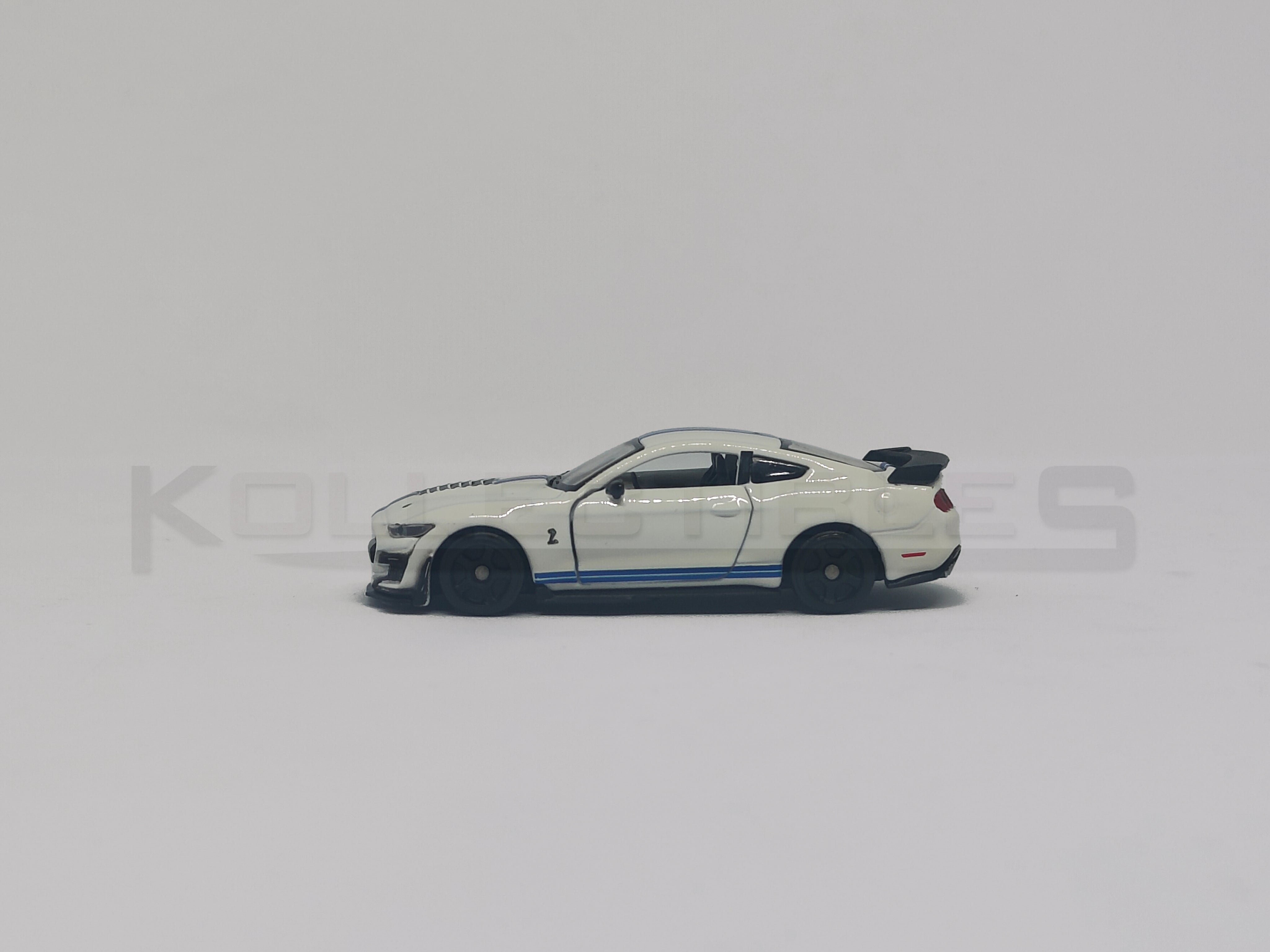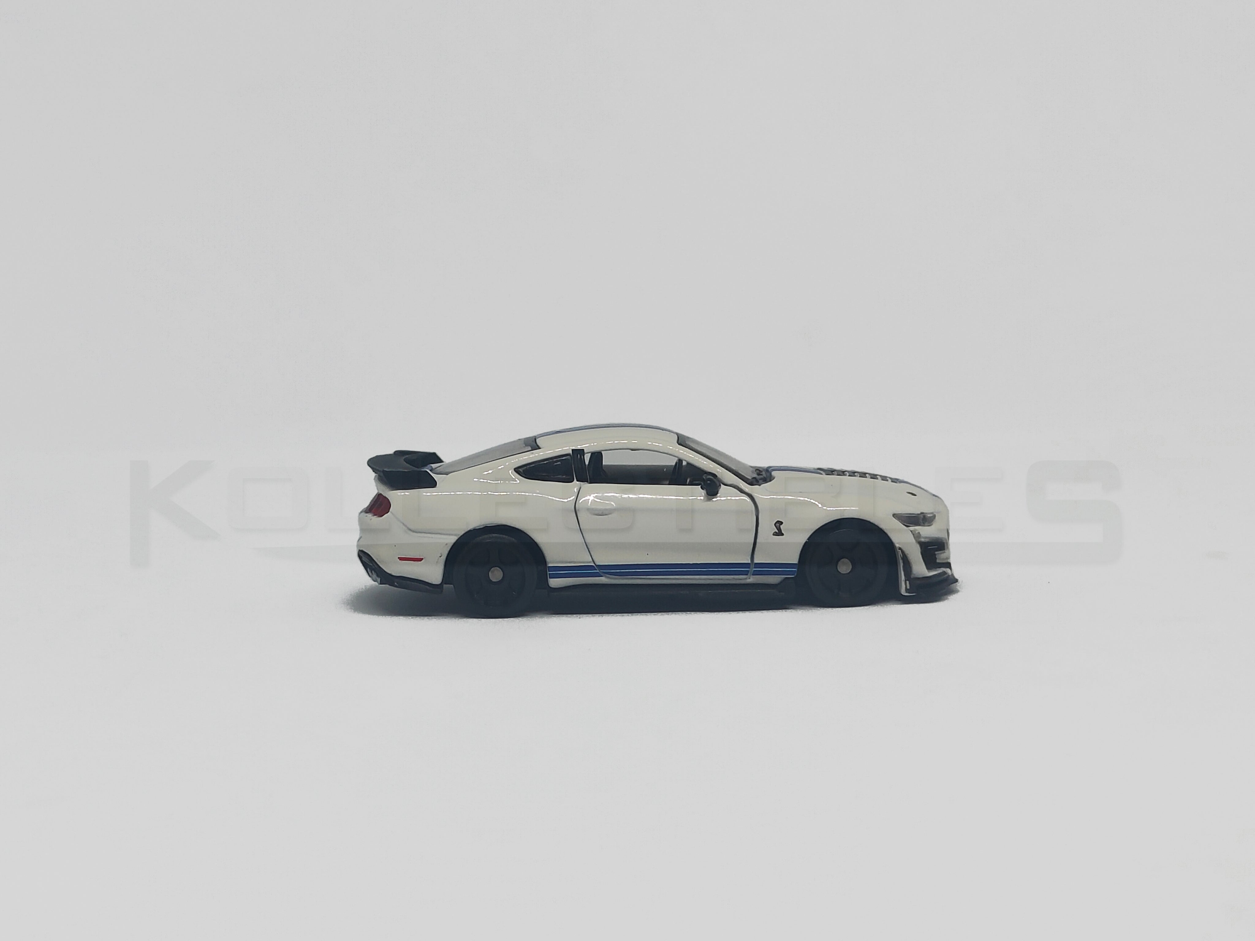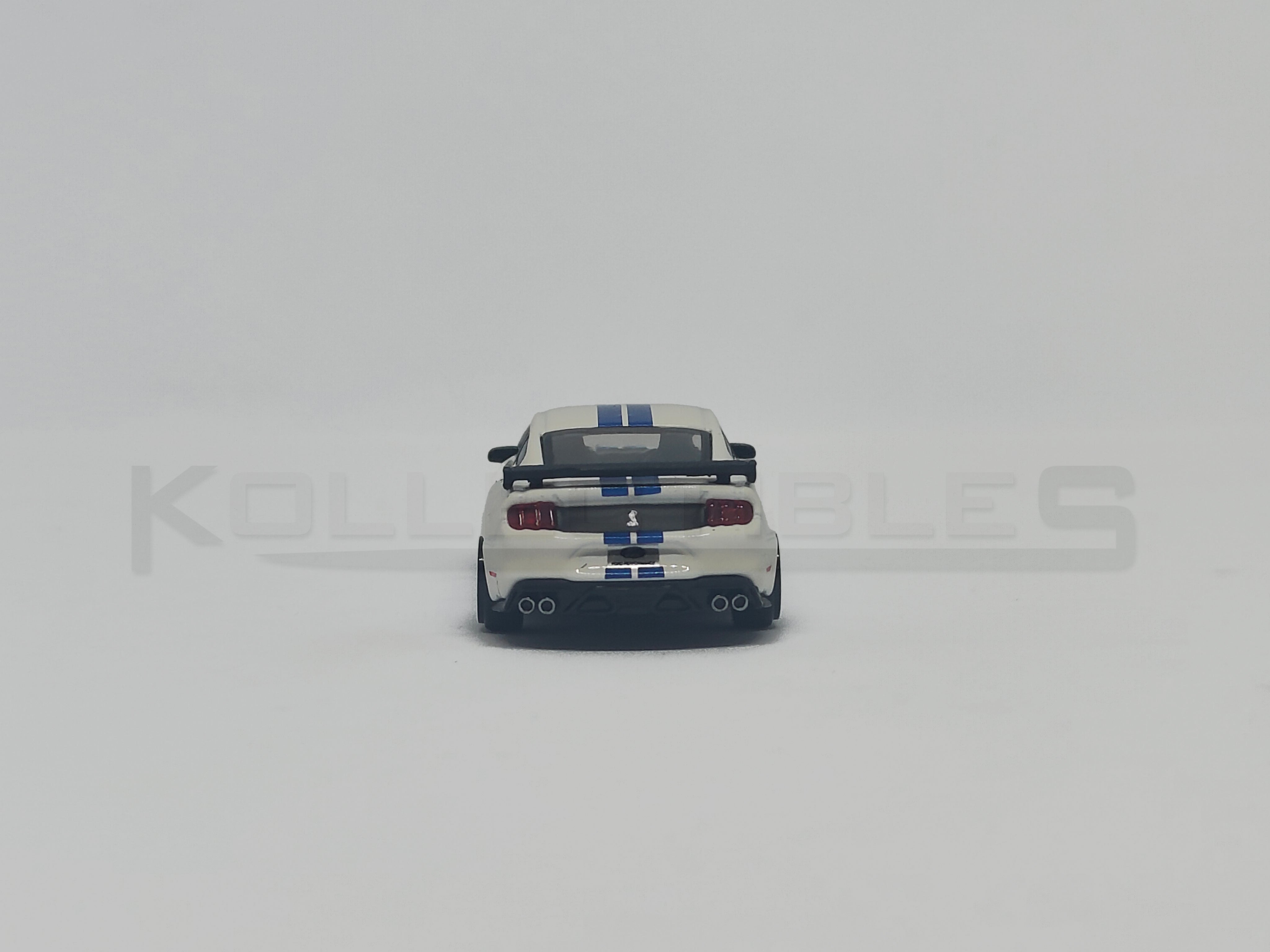 White Finish: Classic white paint complemented by black Shelby stripes for a true-to-life appearance.